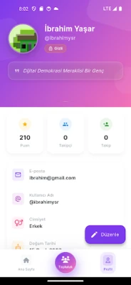 Kişisel profilinizi dilediğinizce düzenleyerek ve kimliğinizi güvenle doğrulayarak topluluk içindeki yerinizi sağlamlaştırın. Takip ettiklerinizi ve takipçilerinizi kolayca yönetin, sosyal etkileşiminizi geliştirin. E-posta/şifre veya Google hesabınızla hızlı ve güvenli giriş seçenekleri sayesinde, platforma erişiminiz her zaman sorunsuz olur. Güvenlik ve gizlilik ilkeleri, tüm kişisel verilerinizin korunmasında en büyük önceliğimizdir. Şeffaflık ve güven taahhüdümüzle, bilgilerinizin emin ellerde olduğunu bilerek özgürce katılım sağlayın. Geleceği birlikte tartışmak, önermek ve şekillendirmek için sizi bu katılımcı yolculuğa davet ediyoruz.