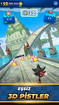 Kirpi Sonic ile etkileyici 3B ortamlarda hızla koş, zıpla ve dön. Bu çılgın sonsuz koşu oyununda zorlu engelleri aşarak en yüksek skoru yapmaya çalış. Hızlı reflekslerinle kayarak geç ve maceranın tadını çıkar.